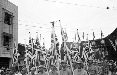 0030遊行車頭掛著日軍手舉「無條件投降」布條的