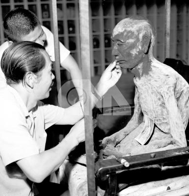 為雕刻家劉獅正在為慈航法師遺體整修臉部。