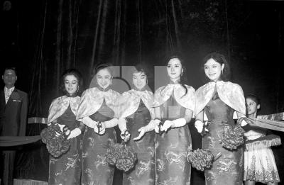 0001—0002圖為台北市樂聲大戲院開幕時應邀剪綵的(右起)江青、汪玲、鈕方雨、甄珍、李登惠5人;其中江青、汪玲是李翰祥自香港帶來,鈕方雨發掘自我國空軍大鵬國劇隊幼年班,李登惠是福州戲知名坤角,而甄珍更是國聯公司自眾多應徵者中唯一被錄取的新星,時人共稱為「國聯五鳳」。