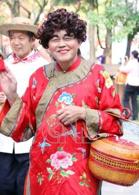 俗踩街活動,1名男扮女裝的媒人婆(圖)在現場發送
