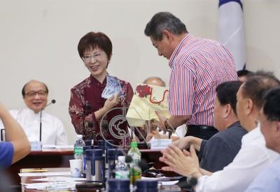 代表收下,洪秀柱也當場義賣,請現場中常委認購,為