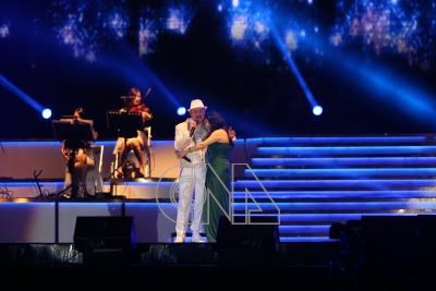 歌手余天(左)「傳奇五十 華麗轉身」演唱會12日晚