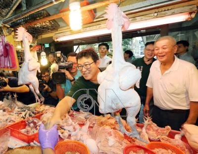 台北市議員的陪同下,到台北市木柵市場拜票,與攤商