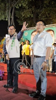 )參選高雄市議員的競選總部成立晚會,父子倆同台向
