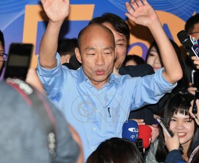 高雄市長當選人韓國瑜(中)22日晚間赴政大出席政大