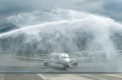 機場降落的台灣虎航飛機及噴水歡迎儀式,這架台灣虎