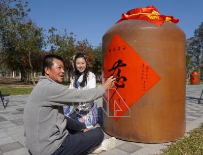 升大酒甕,套上紅布並邀請書法老師現場揮毫,前縣長