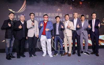 風度影業12日在台北內湖舉行總部開幕儀式,衛山資本董事長林伯駿(左4)、風度影業董事長鄭人豪(右4)及執行長彭小刀(右2)、闊世電影監製馬天宗(右3)、韓國導演郭在容(右5)、風度影業韓國分公司顧問金亨駿(左2)、韓國編劇吳相昊(左3)等人一同出席。