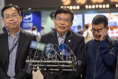 交通部長王國材(中)12日率團參加將在美國召開的APEC第11屆運輸部長會議,行前在桃園國際機場接受媒體聯訪。
