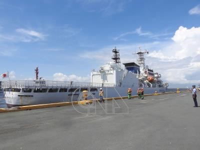 菲律賓海岸巡防隊、美國海岸防衛隊及日本海上保安廳1日展開首次「肩並肩」(KAAGAPAY)三邊海事演習以強化聯合行動力。圖為日本秋津洲號大型巡邏船抵達馬尼拉港。