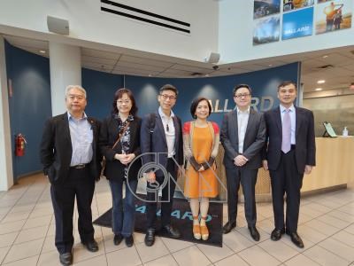 立委鍾佳濱和台灣駐溫哥華政府代表以及商界代表等,參訪加拿大氫能及電池燃料解決方案的領導企業巴拉德動力系統。右起:溫哥華台貿中心主任邱仕敏、巴拉德商務發展部亞太區負責人楚爾(Norman Chor)、駐溫哥華辦事處處長劉立欣、立委鍾佳濱、GTMA加拿大全球衛生協會會長邱麗蓮和協會成員蔡志遠。