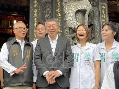 台灣民眾黨總統參選人兼黨主席柯文哲(右3)17日走訪桃園市,一早就到蘆竹區南崁五福宮參拜,與五福宮主委陳宗賢(左)互動交流。