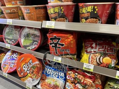 韓國最大速食麵品牌農心食品27日宣布,7月1日起調降旗下辛拉麵及蝦條售價。圖為韓國便利商店貨架。