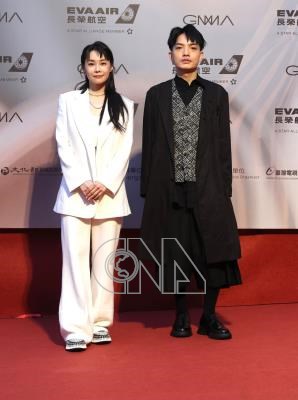 第34屆金曲獎星光大道1日傍晚在台北小巨蛋外熱鬧展開,現場星光熠熠,歌手鄭宜農(左)與作曲人何俊葦(右)一起開心走紅毯。