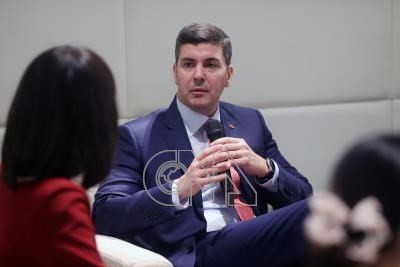 巴拉圭總統當選人潘尼亞(Santiago Peña Palacios)(中)15日下午在台北君悅酒店接受媒體聯訪時表示,對手在競選期間曾表態要與北京當局建交,但勝選的他並不認同,反而認為和台灣維持外交和商業關係,才是正確道路。