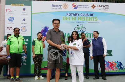 印度德里高地扶輪社16日舉辦騎單車愛地球活動,向主要贊助者太思科技集團董事長、新任德里台商會會長何俊炘(前左)贈送盆栽,表示感謝。