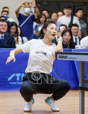 奧運金牌得主、中國桌球好手丁寧(前)17日與陸生參訪團一同造訪政治大學,並下場與學生交流球技,現場展示招牌動作「下蹲砍式發球」。