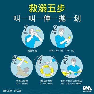 若不幸遇到他人溺水,牢記溺水救人五步驟「叫叫伸拋划」,避免親自下水救人。中央社製圖 112年7月19日