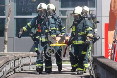 配合國軍漢光39號實兵演習,北部地區24日下午1時30分起至下午2時實施萬安46號演習,台北市南港車站模擬遭飛彈襲擊,消防人員迅速趕抵現場出動擔架救援。