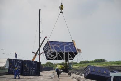 帛琉籍貨櫃船「天使輪」高雄港外海進水沉沒,貨櫃打撈作業與颱風賽跑,高雄港務分公司表示,海警發布後,只要海況允許會持續打撈,並優先處理有飄移風險貨櫃。圖為25日貨櫃打撈處理情形。