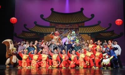 紙風車劇團夏季公演「順風耳的新香爐」27日在台北城市舞台舉行彩排記者會,劇團成員和與會者上台合影,邀請大小朋友一起看戲。