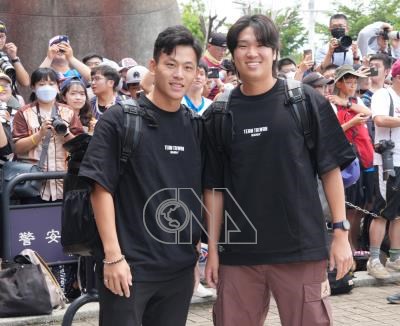 2023中華職棒明星賽29日傍晚在台中洲際棒球場的賽事因雨延期,不過中午場外活動仍順利舉行,「中華隊選手上班路」吸引熱情球迷圍觀,本屆中華隊成員古林睿煬(前右起)與戴培峰開心留影。