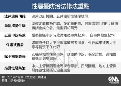 立法院會31日三讀修正通過性騷擾防治法部分條文,明確定義權勢性騷,並加重刑罰,最重處3年徒刑。新法也明定,媒體與任何人不得公開揭露性騷被害人姓名個資,違者最高罰新台幣60萬元。中央社製圖 112年7月31日