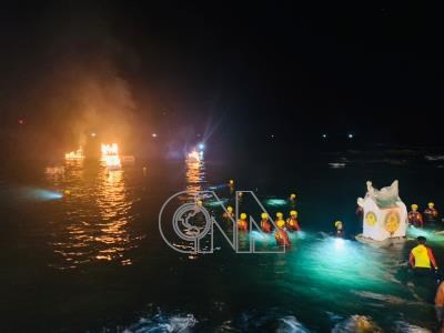 鷄籠中元祭放水燈遊行29日晚間在基隆市區封街舉行,遊行結束後,各姓氏宗親會水燈頭送往八斗子望海巷,在道長進行水燈科儀後,水燈頭依序點燃推向海面。