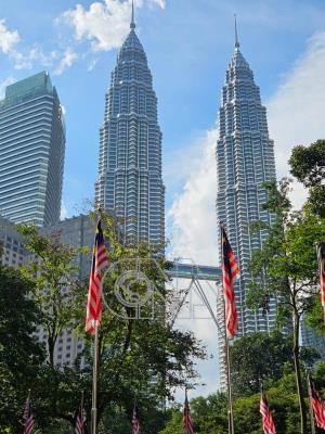 馬來西亞8月31日將舉行獨立66週年國慶日慶祝活動,各地百貨商場與街邊路口都看到國旗飄揚與相關看板。吉隆坡知名地標雙子塔也聚集慶祝人潮,圖為雙子塔。
