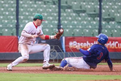 U18世界盃棒球賽台灣隊3日預賽在台中洲際棒球場與墨西哥隊交手,台灣隊李勛傑(右)在6局上趁隊友敲安時滑向三壘。