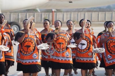 總統蔡英文(右2)率團訪問友邦史瓦帝尼,當地時間5日下午4時抵達恩史瓦帝三世國際機場,史國舞者穿著傳統服飾,以歌聲和舞蹈表達歡迎之意。