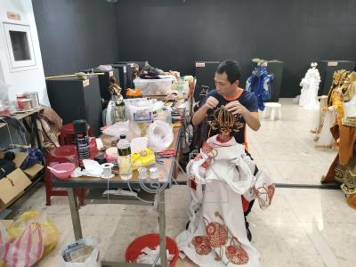 嘉義縣表演藝術中心「遊於偶藝精工布袋戲偶展」裡有10尊三昧堂精工戲偶5日因地震倒地受損,三昧堂「木偶醫生」王文志(圖)近日趕工修復受損戲偶。