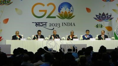 20國集團(G20)峰會9日在新德里登場,印度外交部長蘇杰生(Subrahmanyam Jaishankar,左3)下午召開記者會,宣布領袖們通過新德里領袖宣言。