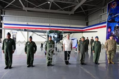 菲律賓空軍19日在克拉克空軍基地舉行美國捐贈的C-208B EX偵察機移交典禮。菲律賓防長鐵歐多洛(中)、參謀總長布勞納(右3)、美國駐菲聯合軍事援助小組組長伊凡斯(Edward Evans)(右)等人合影。