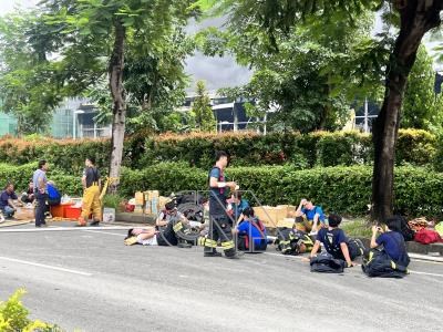 屏東明揚國際廠房持續悶燒 消防員就地稍作休息