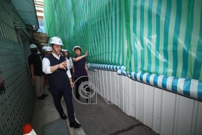 台北市長蔣萬安(前)26日傍晚前往大直街視察下陷房屋拆除作業,並巡視工地周遭情況。