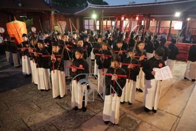 全台首學台南孔廟28日舉行祭孔儀式,忠義國小學生跳著六佾舞,場面隆重。