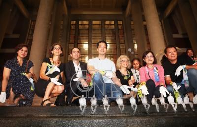 2023台北白晝之夜7日晚間熱鬧展開,台北市長蔣萬安(左4)、副市長林奕華(前右2)等人前往參觀於國父紀念館展出的巴西藝術家阿茲維多(Néle Azevedo)(左5)作品「最小的紀念碑:小冰人藝術行動」合影留念。