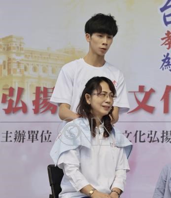 中華傳統文化弘揚孝道總會等單位14日在總統府前舉辦「台灣的孝 孝親報天恩」萬人洗腳暨反毒宣導嘉年華,杭州亞運拳擊金牌女將林郁婷(後)出席,現場為媽媽按摩放鬆。