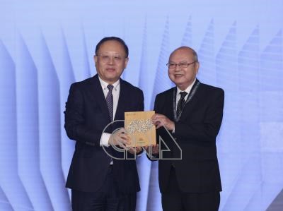 文化部文協獎章頒獎典禮16日在台北華山1914文化創意產業園區舉行,財團法人台北保安宮董事長廖武治(右)獲獎,由文化部長史哲(左)授獎。