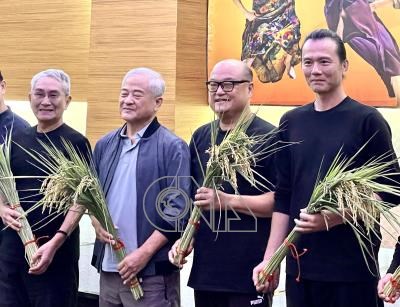 2023年「池上秋收稻穗藝術節」登場,雲門舞集創辦人林懷民(左起)、台灣好基金會董事長柯文昌、池上鄉文化藝術協會理事長梁正賢與雲門舞集藝術總監鄭宗龍21日出席記者會。