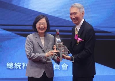2023年總統科學獎頒獎典禮24日在總統府舉行,「應用科學組」得主為中央研究院士胡正明(右),總統蔡英文(左)親自頒獎表揚。