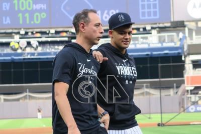 美國職棒大聯盟紐約洋基本季傷兵累累,強打新秀杜明奎(右)9月亮相只打8場就因右肘受傷高掛免戰牌。圖為9月7日杜明奎賽前與球團人員交談。