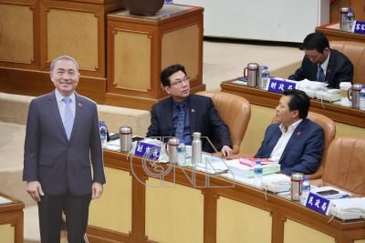新北市副市長劉和然(前左)遭市議會民進黨團質疑「代理市長」身分,3日總質詢時,將座位上的「市長」名牌取下,一旁的副市長朱惕之(前右)則將「副市長」名牌挪到兩人中間共用。