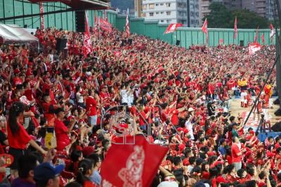 中華職棒7戰4勝制總冠軍賽展開,5日第2戰繼續由味全龍隊在主場天母棒球場迎戰樂天桃猿隊,萬張門票早已完售,是聯盟總冠軍賽史上第57場滿場比賽、天母棒球場第4場滿場比賽。圖為龍隊球迷身穿紅衣在觀眾席賣力為選手加油。