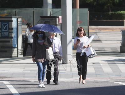中央氣象署預報,6日下半天起鋒面通過台灣北部海面,東北部地區將有短暫雨,並有局部較大雨勢發生機率;各地清晨低溫約攝氏22至25度,北部及東半部白天高溫約29、30度,日夜溫差大。圖為6日上午台北市信義區民眾撐傘遮陽。