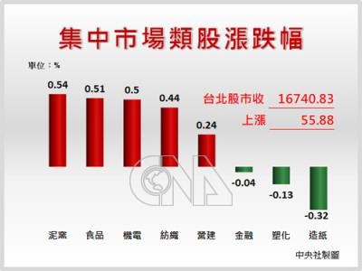 八大類股漲跌幅:泥窯股漲0.54%、食品股漲0.51%、塑化股跌0.13%、紡織股漲0.44%、機電股漲0.5%、造紙股跌0.32%、營建股漲0.24%、金融股跌0.04%。