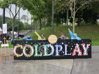 英國天團Coldplay酷玩樂團22日晚間在吉隆坡開唱,粉絲們在有Coldplay字樣的立牌前合影。
