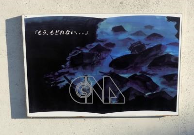 在日本311大地震中被海嘯沖毀的請戶小學,校舍如今成為展示館。繪製圖片顯示當年老師帶著學生逃到山上後折返查看狀況,看到一片汪洋的絕望心境。
