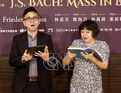 國立台灣交響樂團、台北愛樂室內合唱團合作推出巴哈「B小調彌撒」音樂會,將於12月5日在台北國家音樂廳,12月6日在高雄衛武營音樂廳演出。圖為男高音林義偉(左)、女高音林慈音(右)28日在活動記者會中演出精彩片段。